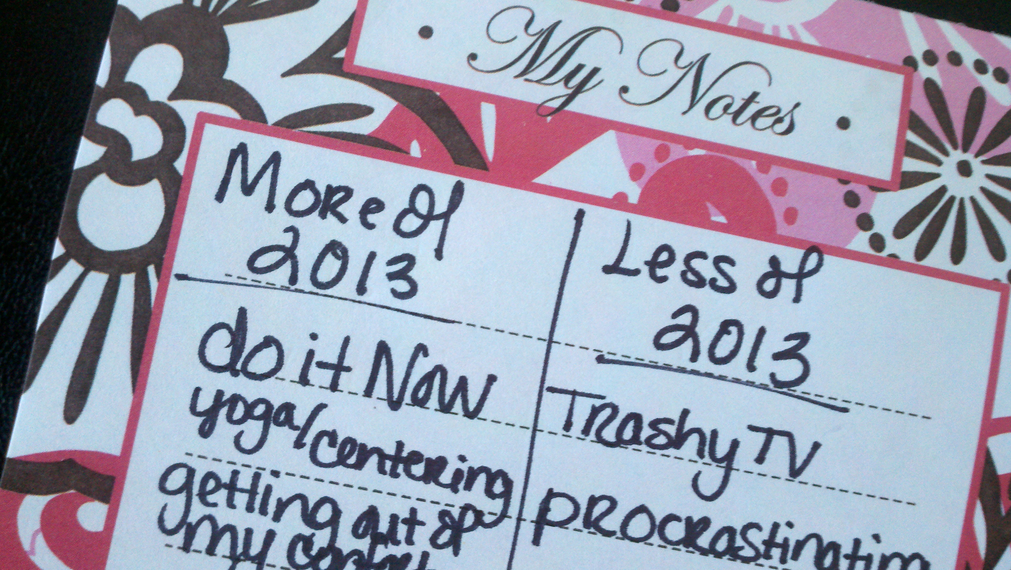 The mechanics of it are pretty straight-forward. Get out a sheet of paper, divide it into two columns, and write “I want More of in 2013” in the first column, and “I want Less of in 2013” in the second column. You could do this on the computer, but personally, I’m over creating spreadsheet trackers, and there is also something about the physicality of writing things down that I like. (I end up feeling more committed, because they get cemented it in my brain.)